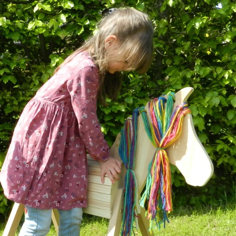 Für die Erstausstattung wird Schafwolle mitgeliefert. Später können die Kinder ihr Pferd frei nach ihren Wünschen mit beliebiger Wolle in Länge und Farbe bestücken. Das stellt einen sehr hohen Spielwert dar!
