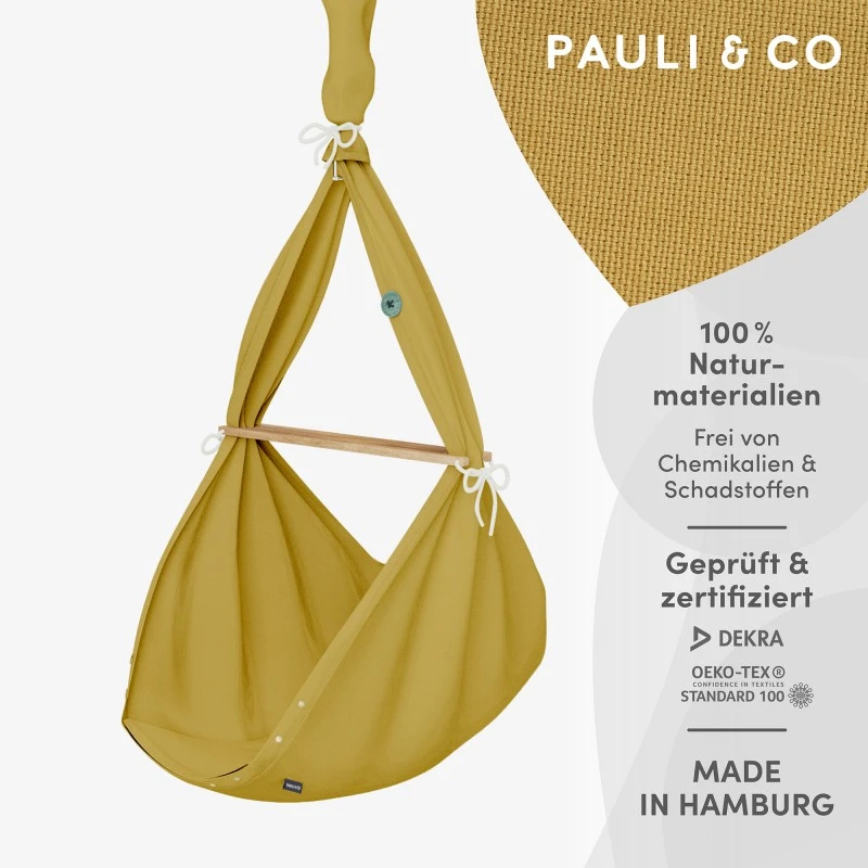 Die Wiege mit der Matratze „Schurwolle“ ist mit tierischen Materialien (Bio-Schurwolle) verarbeitet.