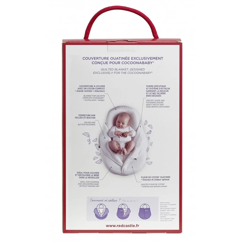 Sie ist ideal, um das Baby zuzudecken ohne es aufzuwecken. Ihre spezielle Form und die Befestigung am Cocoonababy halten Mund und Nase des Babys frei. Geöffnet wird die Decke ganz einfach über den Knopf- und den Klettverschluss.