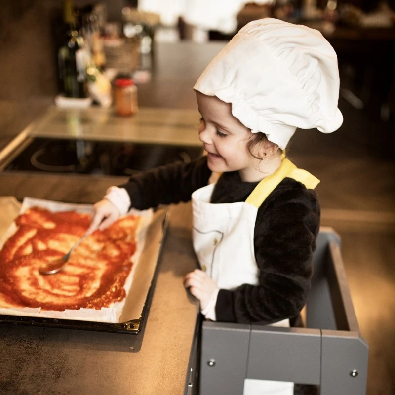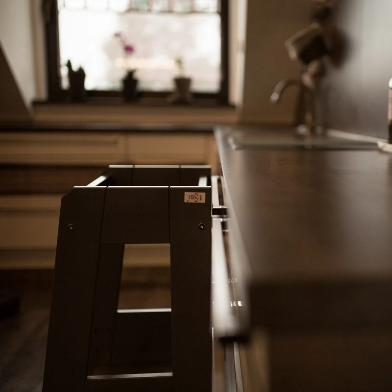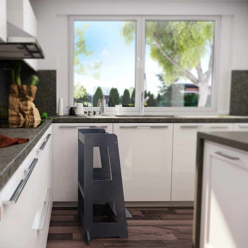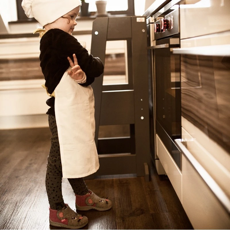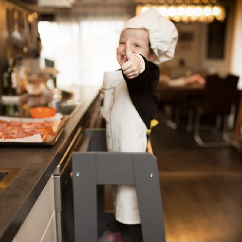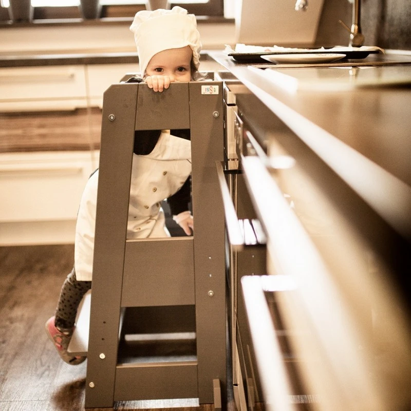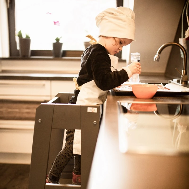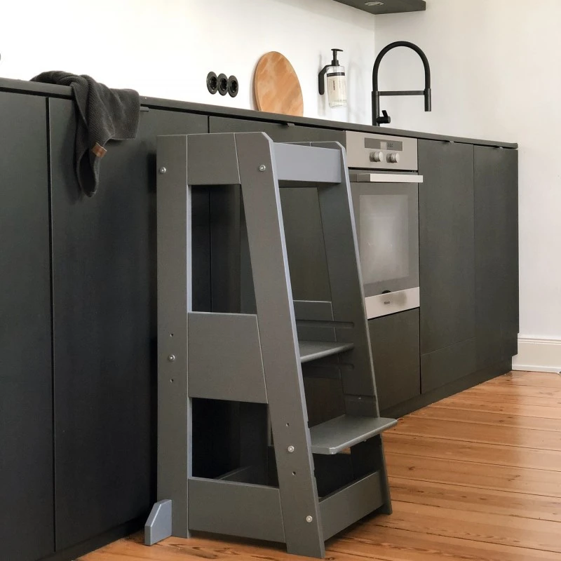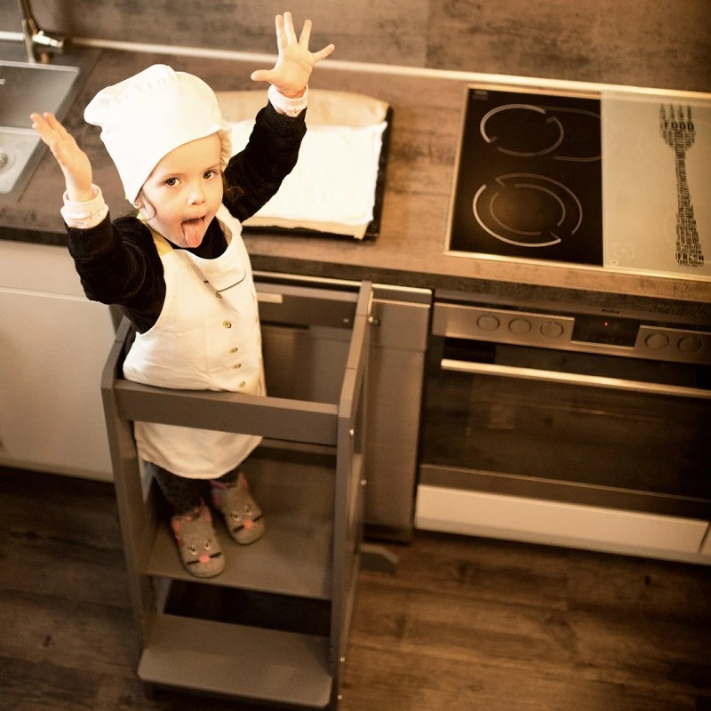 Der Lernturm wurde so konzipiert, dass er Dein Kind näher an die Küchezeile oder den Tisch bringt und es so schon früh soziale Interaktionen mitbekommt und von Dir lernen kann.