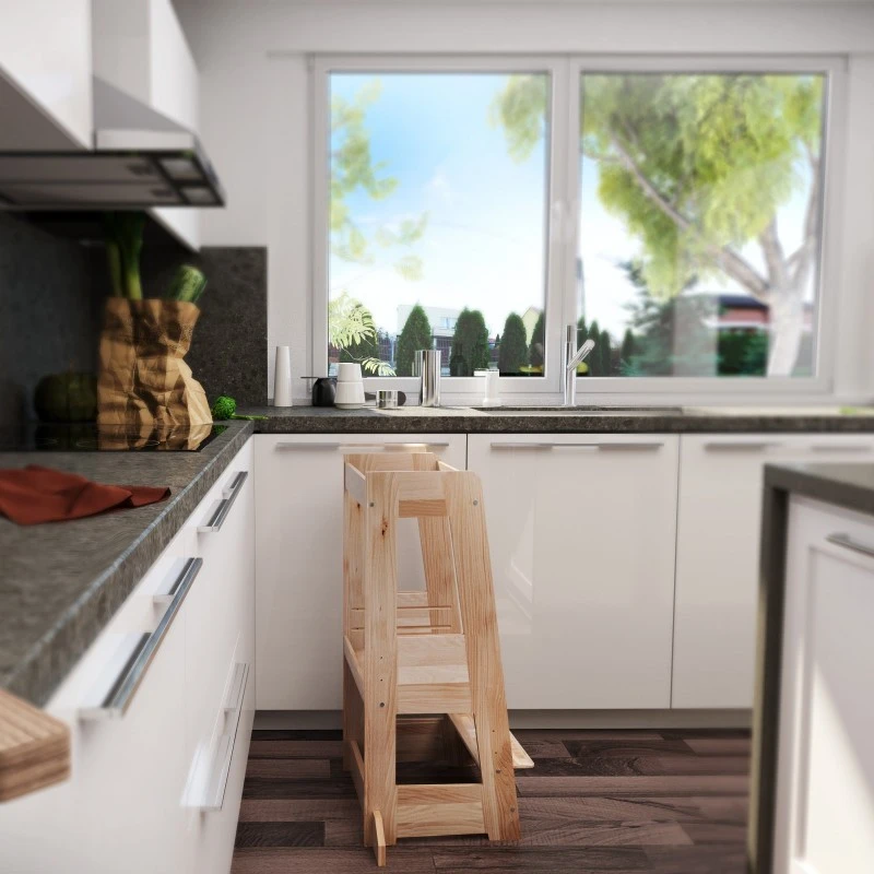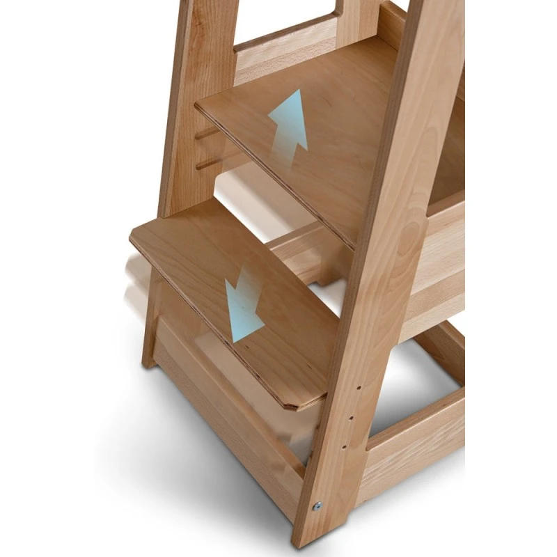 Der Lernturm wurde so konzipiert, dass er Dein Kind näher an die Küchezeile oder den Tisch bringt und es so schon früh soziale Interaktionen mitbekommt und von Dir lernen kann.