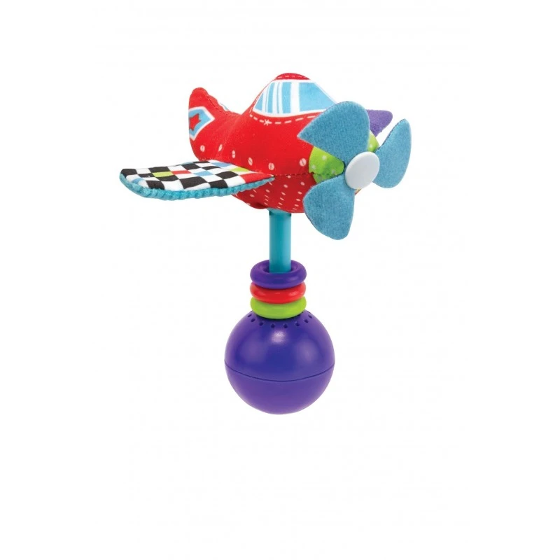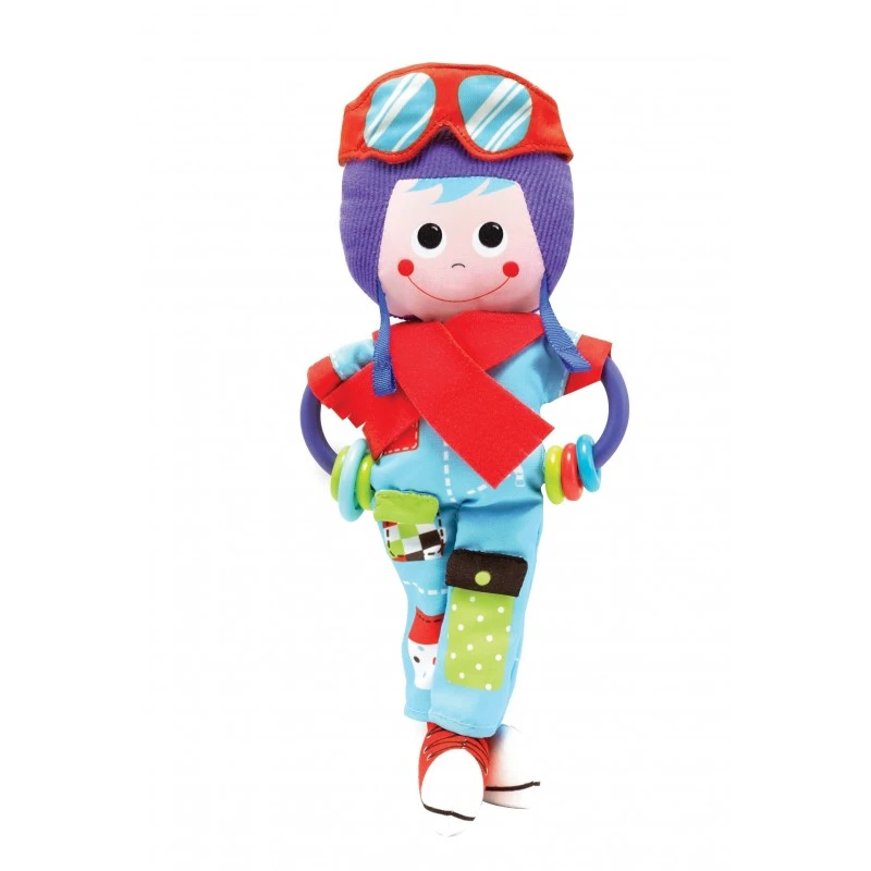 Up, up and away – mit dem elektronischen Rassel-Set „Pilot“ erobern schon die Kleinsten die Lüfte. Die Handhabung ist denkbar einfach: Wird das Flugzeug bewegt, ertönen Soundeffekte und Musik (bei Bedarf abschaltbar). So lernen die Kinder schon ganz früh den Zusammenhang zwischen Ursache und Wirkung kennen. Der freundliche Pilot ist mit unterschiedlichen Oberflächentexturen versehen, die den Tastsinn trainieren. Ein Quietscher und rasselnde Perlen sorgen für zusätzliche Stimulation. Zum Lieferumfang gehören ein Yookidoo-Kunststoffring, mit dem sich das Rassel-Set nahezu überall befestigen lässt, sowie 3 x LR44 Knopfzellen-Batterien.