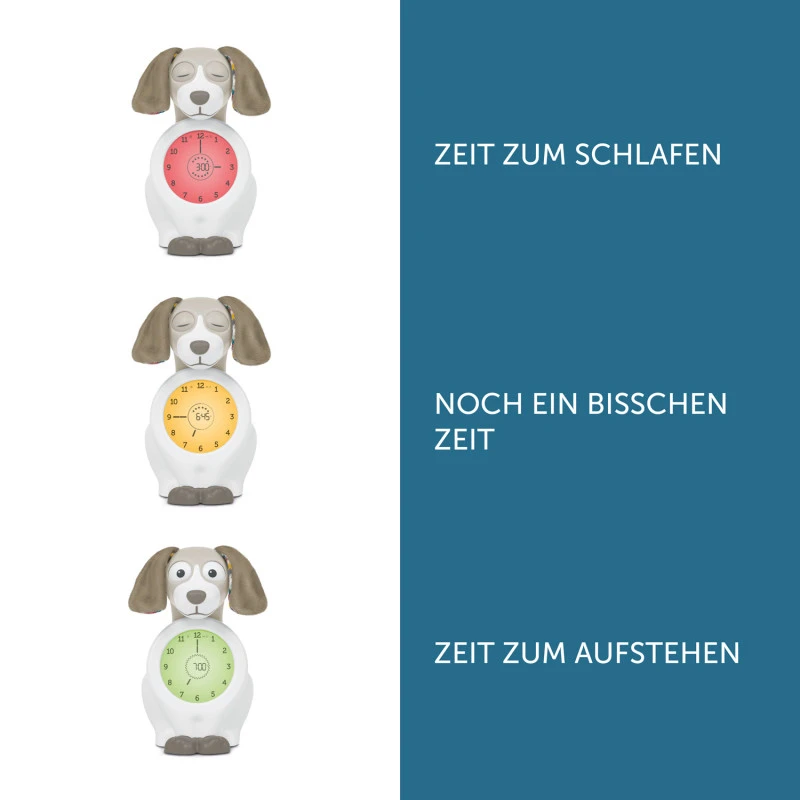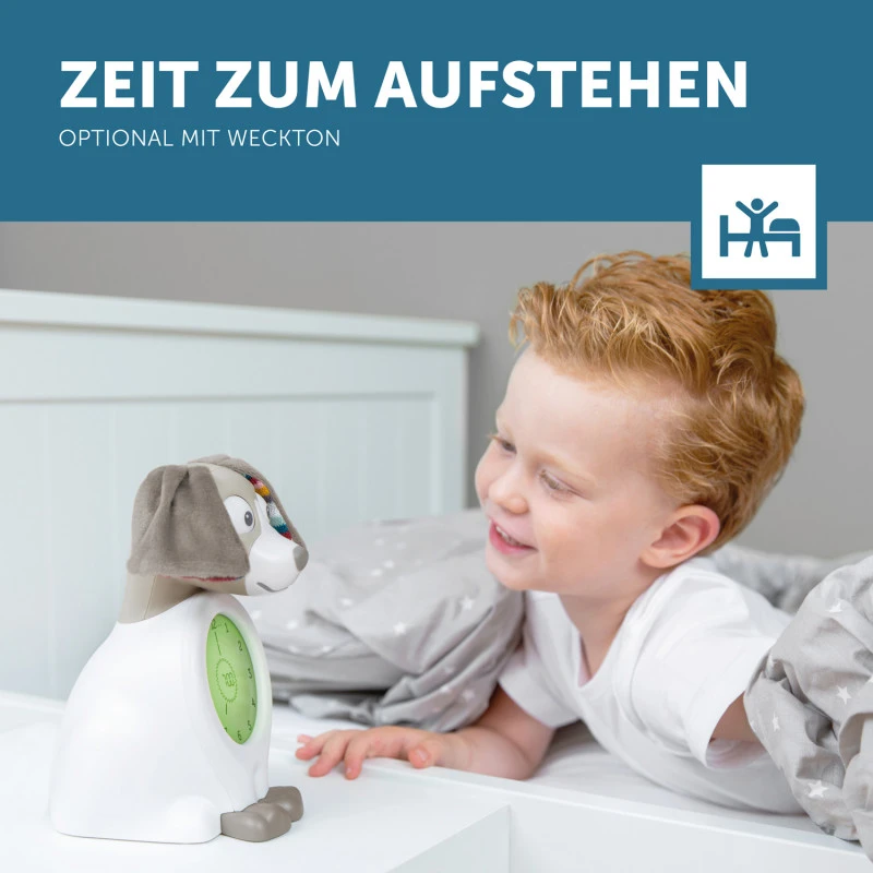 Hund Davy ist ein Schlaftrainer mit Wecker und Nachtlicht in einem.