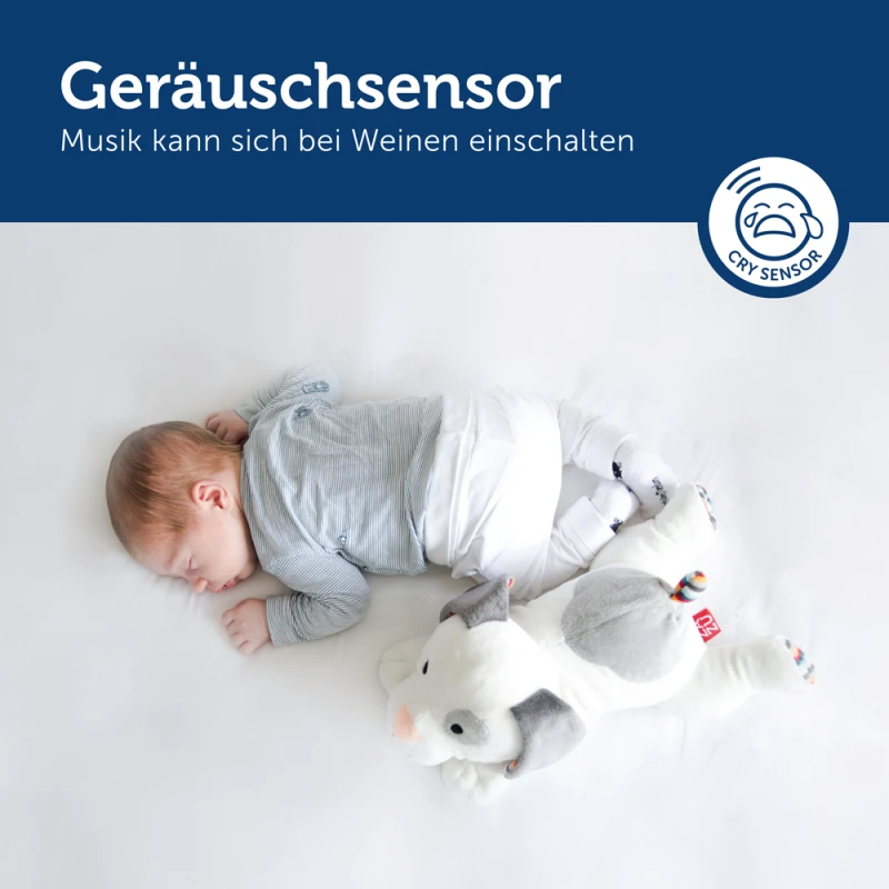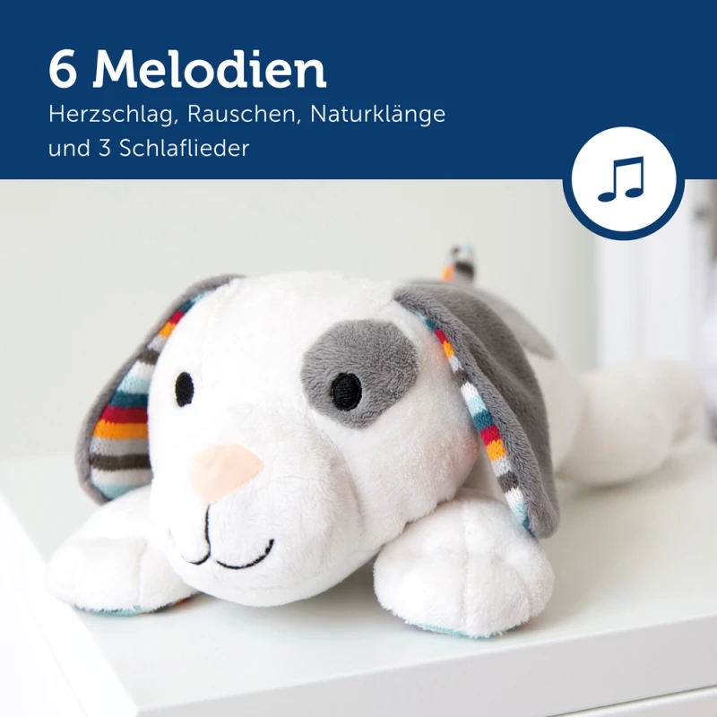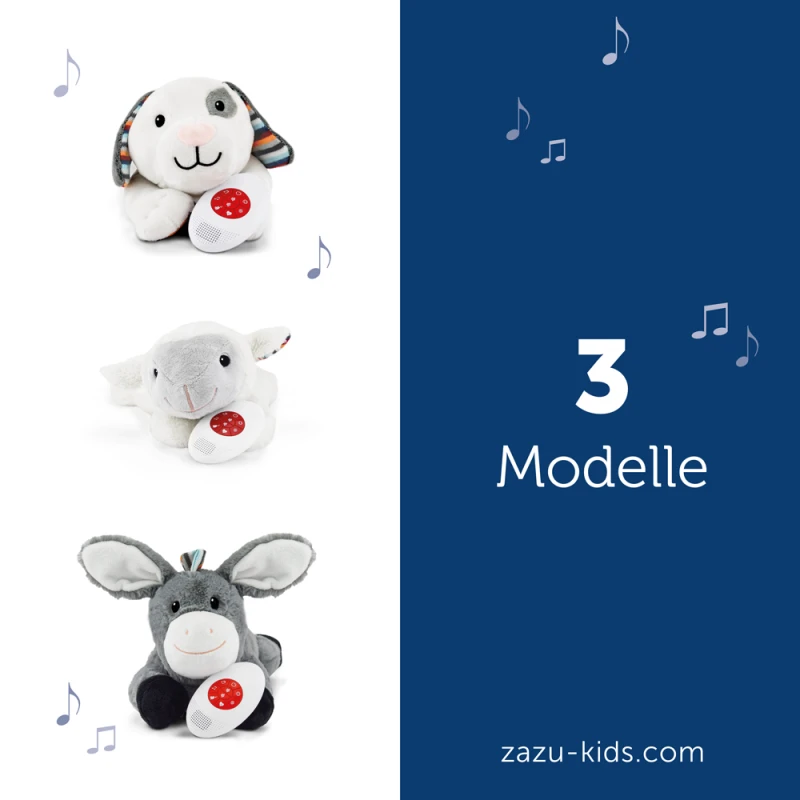 Daneben stehen noch weitere Sounds zur Auswahl: das Rauschen eines Wasserfalls und vier sanfte Melodien, die nacheinader abgespielt werden. Die Töne werden ganz einfach durch Schütteln des Plüschtiers aktiviert, da kann man garantiert nichts falsch machen. Wenn das Baby zu weinen beginnt, schaltet sich das Geräusch von alleine ein. Durch einen integrierten Timer erfolgt nach 10 Minuten eine automatische Abschaltung. Die Lautstärke lässt sich ganz nach Wunsch regeln. Für den Betrieb sind 2 AA-Batterien erforderlich, die nicht im Lieferumfang enthalten sind. Es stehen drei Modelle zur Auswahl: der Hund Dex, das Lamm Liz und der Esel Don. Alle eignen sich für Kinder ab Geburt, sie sind aber so ansprechend gestaltet, dass sie die Kleinen über eine lange Zeit hinweg als liebe Freunde begleiten.