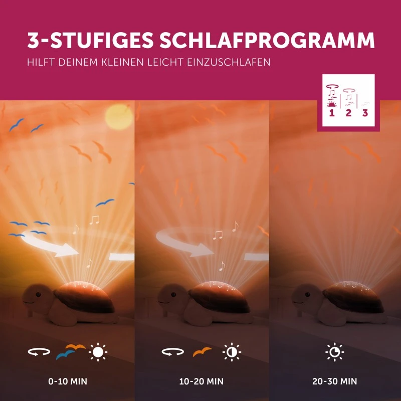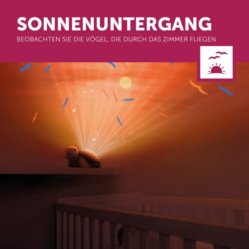 In der letzten Stufe, nach ca. 20 Minuten, ist es schließlich Zeit für dein Baby zu schlafen. Die Vögel fliegen nicht mehr und auch die Musik hört auf zu spielen. Nur noch ganz sanftes Licht leuchtet.