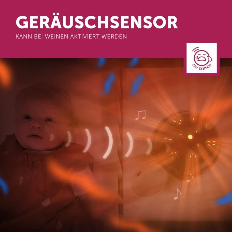 Der Projektor schaltet sich nach ca. 30 Minuten automatisch aus. Wann immer dein Baby aufwacht und schreit, reaktiviert sich Tim bei eingeschaltetem Geräuschsensor automatisch.